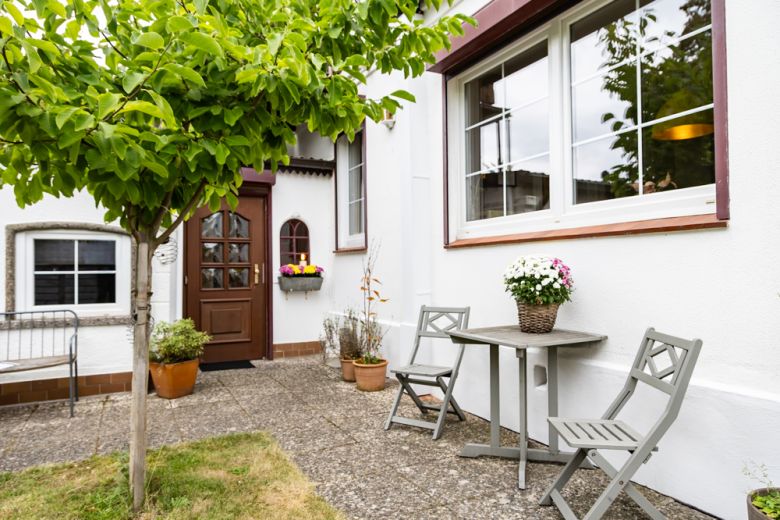 Der Zugang zum Haus erfolgt über eine Gartenpforte, die einen kurzen Zuweg freigibt. Schon hier öffnet sich der Blick in den eigenen Garten – und dennoch liegt der Eingang angenehm zurückgezogen und privat, geschützt vor Einblicken. Eine schöne Lösung, die dem Haus zusätzlich Charakter verleiht.
