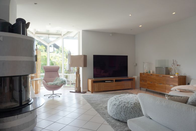 Das Highlight ist das ca. 53 m2 große Wohnzimmer mit Kamin und einer beachtlichen Deckenhöhe von 2,80 m im Erdgeschoss – ein offenes Raumgefühl, das nur selten zu finden ist.