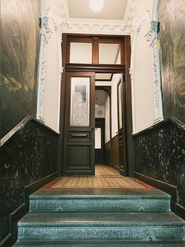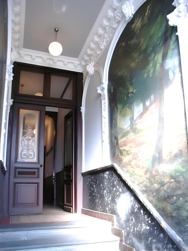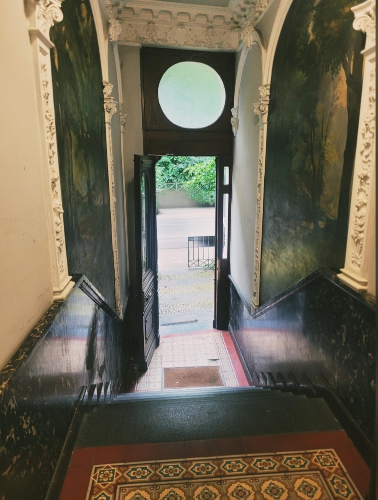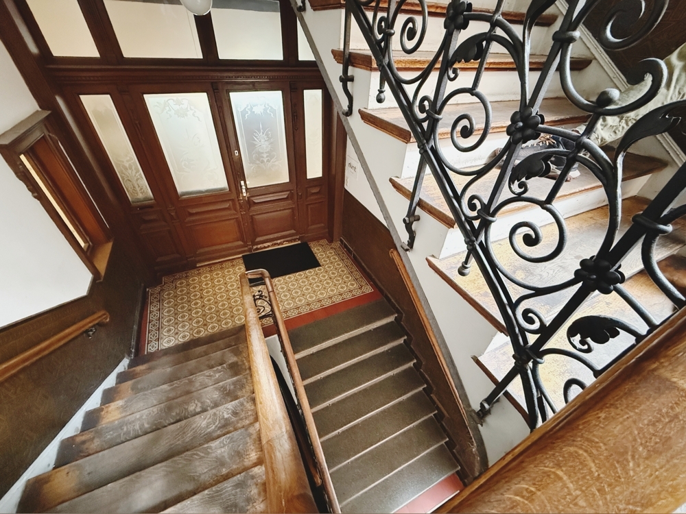 Schon beim Betreten des Hauses offenbart sich die besondere Atmosphäre: Der großzügige Eingangsbereich ist teilweise mit kunstvollen Ölgemälden gestaltet, die dem Gebäude eine beinahe museale Anmutung verleihen. Das historische Treppenhaus beeindruckt mit geprägten Leder-Wandverkleidungen – ein seltenes und äußerst repräsentatives Ausstattungsmerkmal, das den einzigartigen Charakter der Villa unterstreicht.