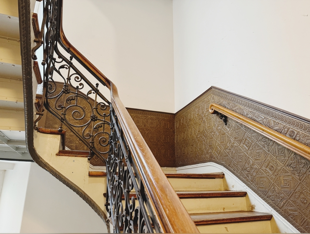 Repräsentatives Treppenhaus mit geprägter Lederwandverkleidung.