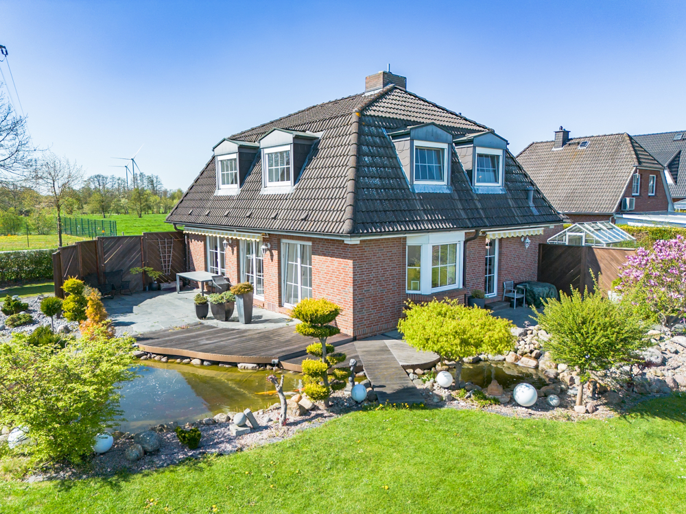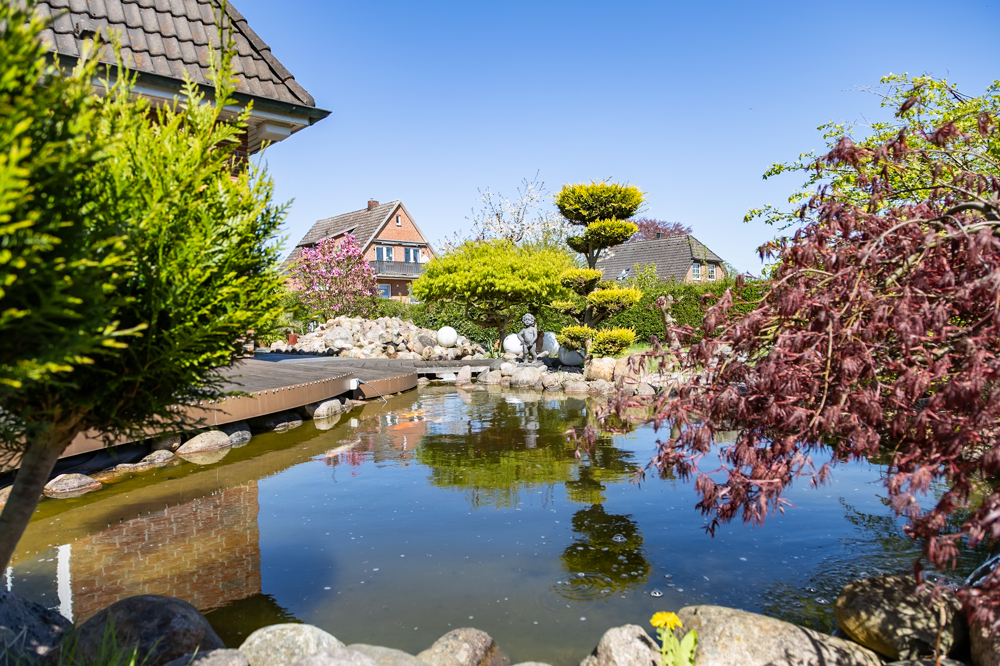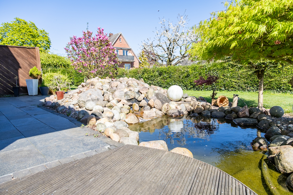 Ein besonderes Merkmal dieser Immobilie ist das großzügige Grundstück. Der Garten ist liebevoll angelegt und bietet mit einem Koiteich, einem kleinen Bachlauf, einem fest installierten Gewächshaus sowie einem Schuppen vielfältige Gestaltungsmöglichkeiten für Gartenliebhaber.
